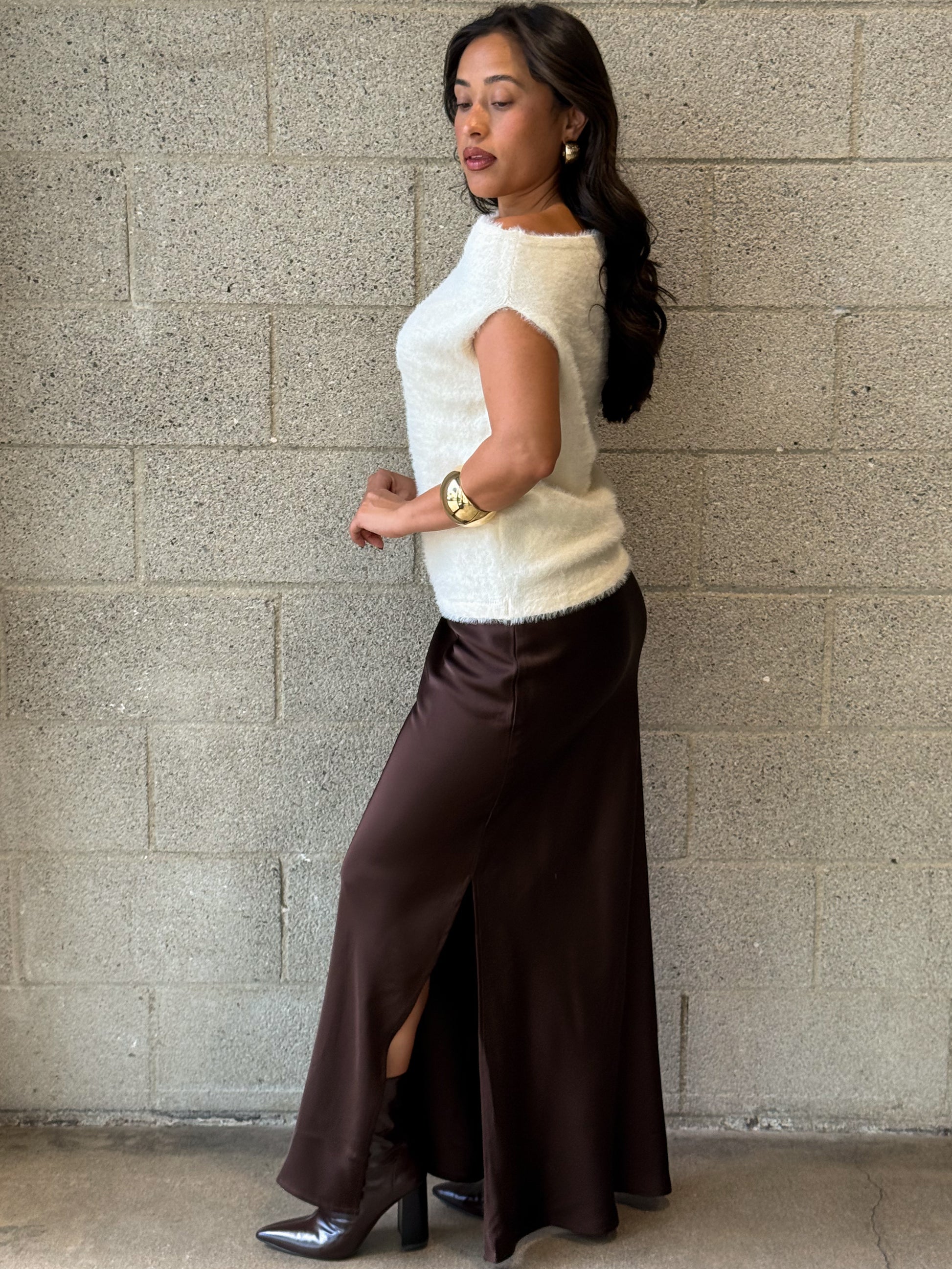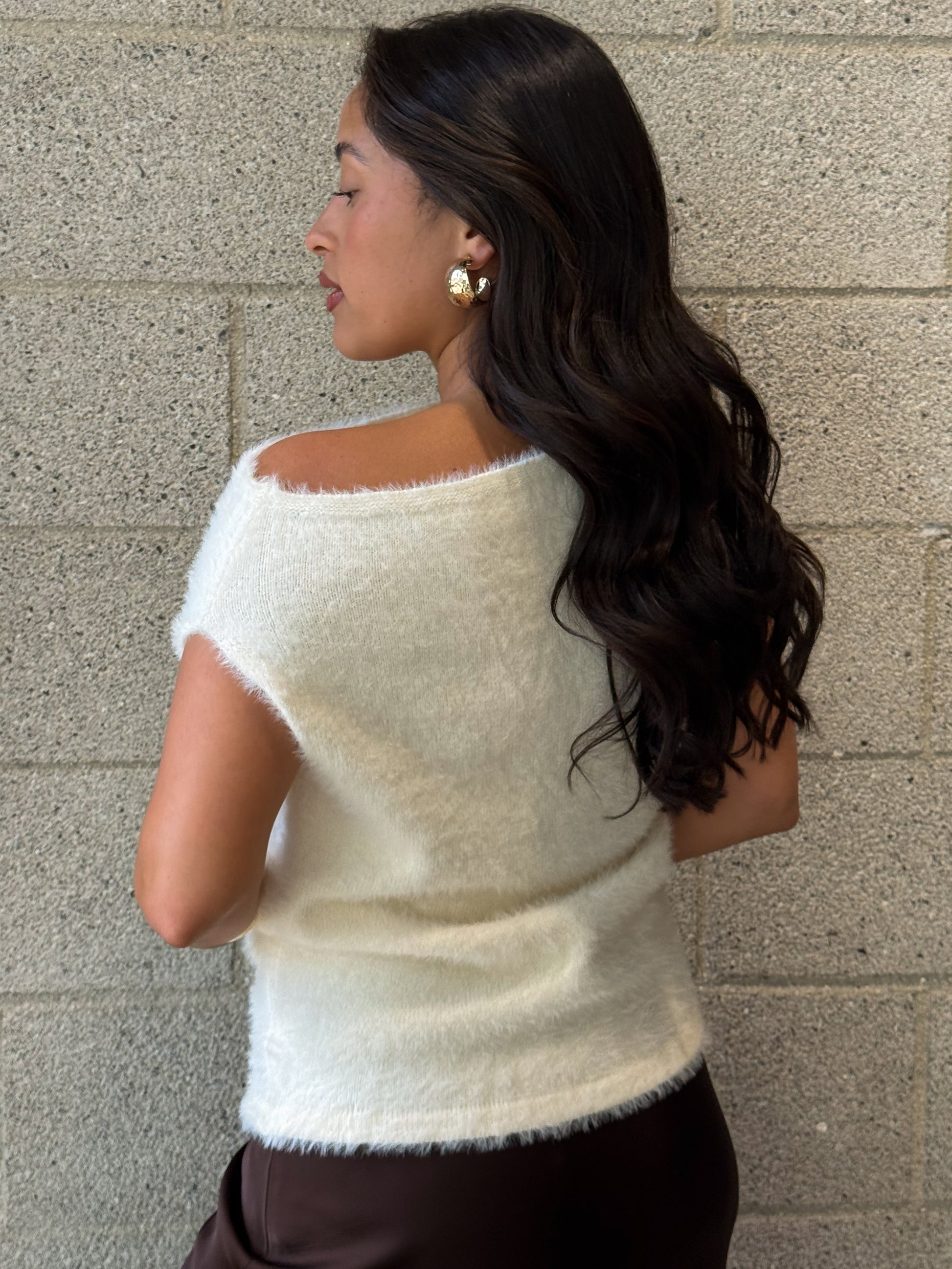 Soft fluffy knit off the shoulder top.