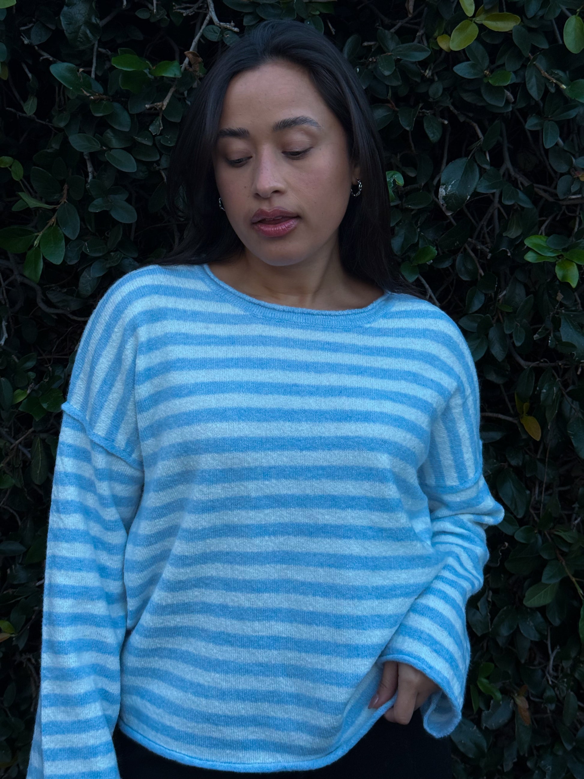 Soft knit stripe sweater top with bell sleeves.