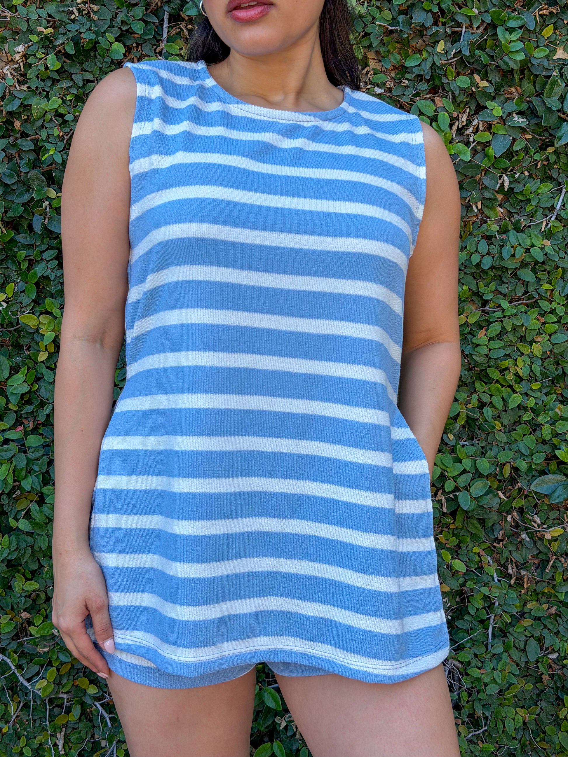 Round neck sleeveless side slit tunic with high waisted elastic waist short w/ pockets.