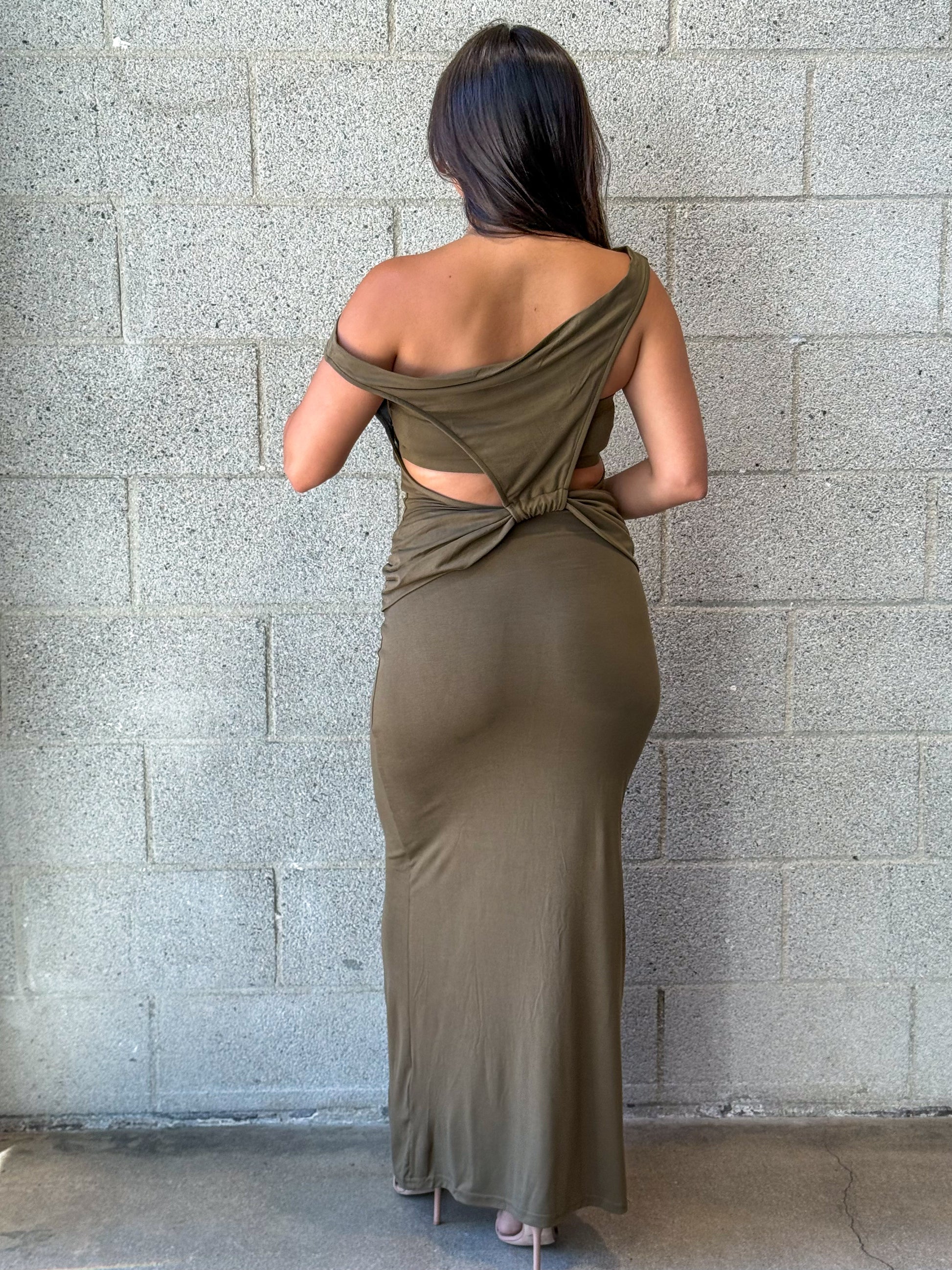 Draped ruched maxi dress with knot detail.